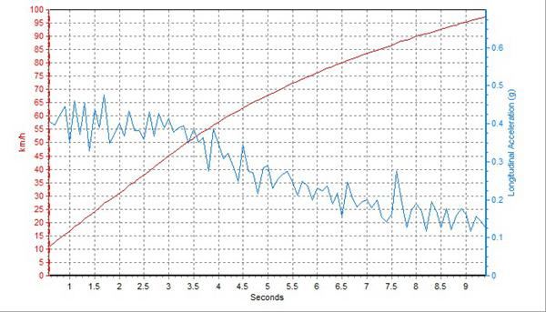 正如数据所显示的,这台车的动力并不算特别强劲,在地面湿润无积水的条件下,关闭空调,使用运动模式,0-100km/h加速时间为9.9s。从加速度曲线我们可以看到,这台车在加速的过程中动力输出非常平稳,加速度值稳步下降,起步时有较好的推背感,加速度可以达到0.45g左右,关闭ESP起步,车轮还会有一段时间的挠地,在当天的测试中,最好的加速成绩正是在关闭ESP的情况下获得的。