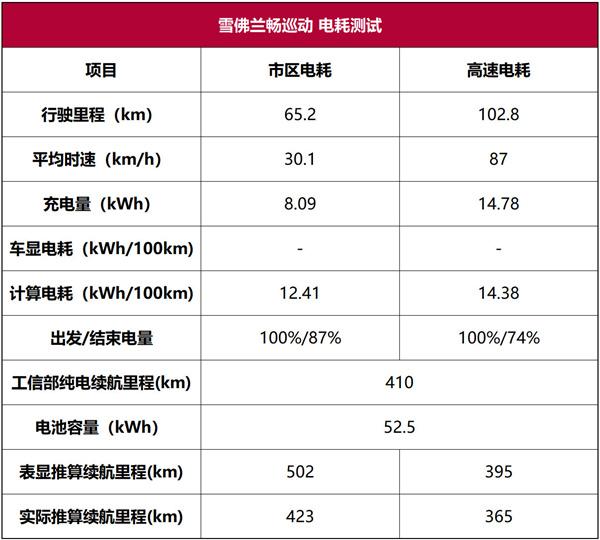 经过实测,畅巡在较为顺畅的市区电耗为12.41kWh/100km,按照电池容量52.5kWh计算,畅巡在这种工况下的续航里程可以达到423km,而如果按照表显掉电百分比推算,其最大续航甚至能够达到502km,这两个数据都超过了它的工信部续航里程。而在高速测试中,畅巡的电耗也仅有14.38kWh/100km,换算可得最大续航里程为365km,达到了工信部续航里程的89%。