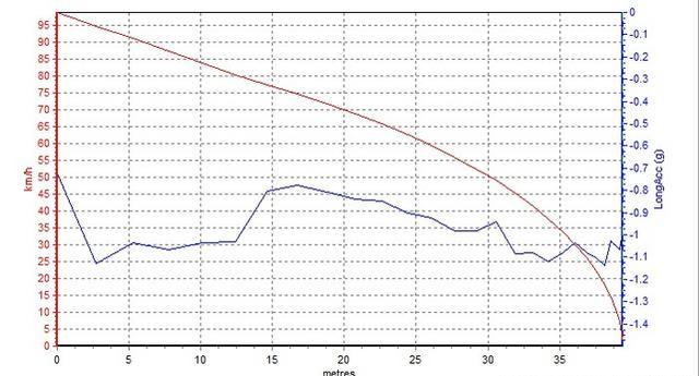由于测试当天地面略潮湿,因此在全力踩下刹车时,制动力并不太均匀,不过ABS还是能够出色完成工作,悬架对于车身的支撑也足够到位,刹车姿态并不狼狈。最终40.53米的表现符合预期,毕竟地面并非全干状态。