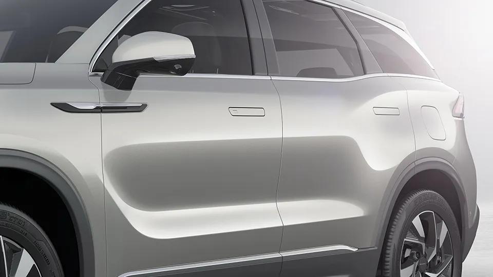 前轮拱处延伸出来的腰线,从B柱之后腰线开始分上下两路,再加之前后车门上的曲面,视觉感受上并不突兀,反而十分干脆和纯粹的表达出了SUV应该有的力量感和年轻运动感。从细节上看,包括隐藏式的感应门把手、五幅式的双色钻石切刀轮毂等等通常只在纯电动车型上出现的设计。这才导致每个见过BEIJING-X7的人都印象深刻,并且产生了新能源车还是燃油车的错觉和误判。