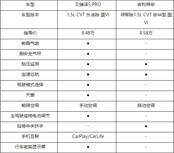 看到这里,想必大家已经十分细致地了解了这两款车的差异。可以发现,同为国产轿车的佼佼者,艾瑞泽5PRO和帝豪还是有很大的区别。帝豪更加稳重,艾瑞泽5PRO更加动感,配置更高。综合来说,艾瑞泽5出众的外观,足够的空间与智能的配置,无论是逃离喧嚣城市的路途,还是纵情山水享受清净的旅程,都可以更好的满足用户需求。现在,你知道选哪款了吗?