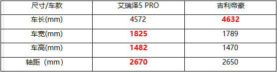 车身尺寸方面,艾瑞泽5PRO在车身长度、宽度及轴距上均有优势。