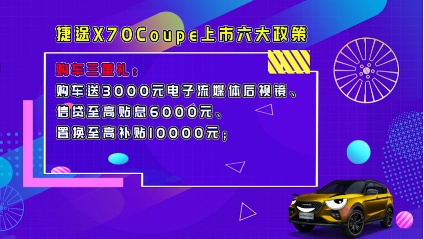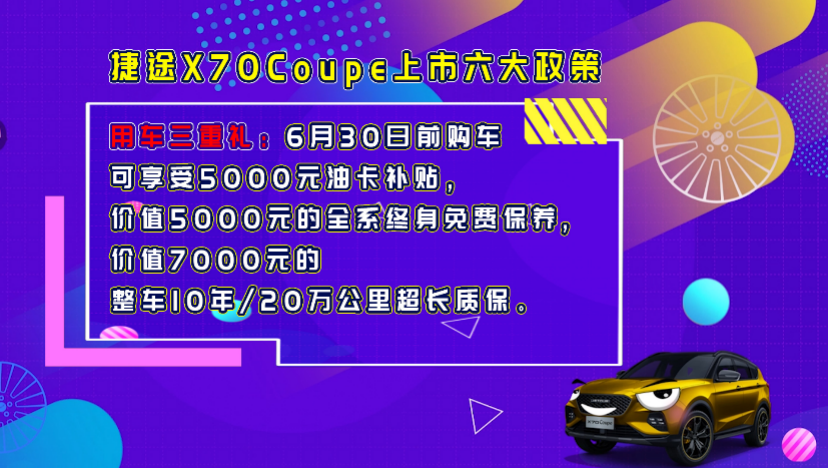 此次X70 Coupe上市,厂商还推出了相应的购车政策。购车送3000元电子流媒体后视镜、信贷至高贴息6000元、置换至高补贴10000元。6月30日前购车,可享受5000元油卡补贴,价值5000元的全系终身免费保养,价值7000元的整车10年/20万公里超长质保。