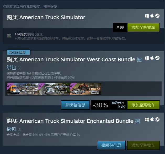 目前《美国卡车模拟》只包含美国东部的几个州,所以就算是购买全套DLC也仅需382元。如果你更喜欢美国的长头卡车和美国的道路风景,那《美卡》就比《欧卡》更值得入手了!