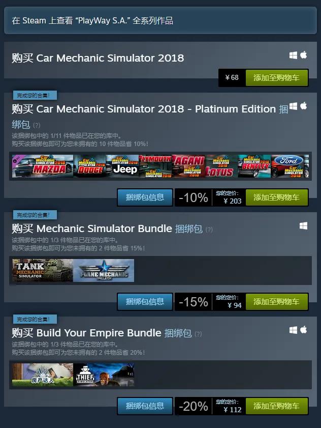 目前《汽车修理工2018》在STEAM的售价是68元,不过除了游戏本体外,厂商还推出了许多带有正版汽车厂家授权的DLC,其中不乏有车迷津津乐道的保时捷、帕加尼等。如果购买游戏本体加全部DLC的话,将会花费390元人民币。