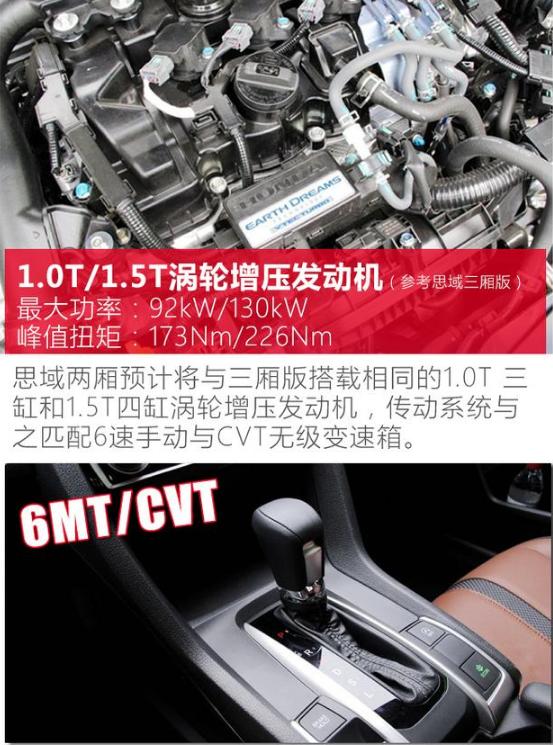 动力方面将延续三厢版同款动力系统,1.5T发动机最大功率177马力,峰值扭矩220牛米,传动系统匹配6速手动或CVT变速箱。另外还有可能同步推出1.0T车型,以及之前呼声很高的SI车型,SI版本或许搭载1.5T高功率发动机,参数看齐CR-V (配置|询价),发动机最大功率142kW(193Ps)/5600rpm,最大扭矩243Nm/2000-5000rpm。基本上看齐了主流的2.0T发动机,变速箱方面或许搭载6MT手动挡,追求极致的操控感和运动感。