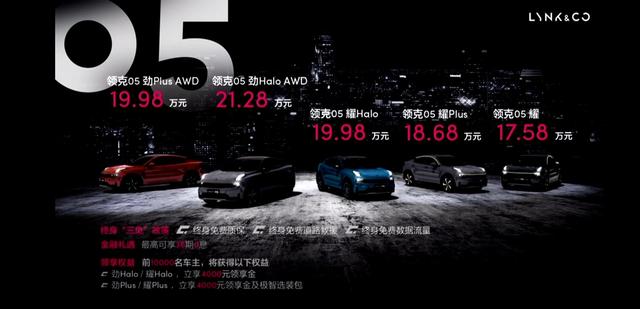 2020年5月5日,领克05正式上市。新车基于CMA平台打造,除此前已公布价格的时间限量版外,新车共推出5款车型,官方指导价区为17.58-21.28万元。在此基础上,购车可享终身“三免”政策(终身免费质保、终身免费道路救援、终身免费数据流量),同时可享最高36期0息金融政策:前10000名车主,还将享受多重权益。