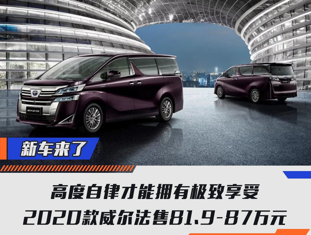 4月30日,水滴汽车APP通过一汽丰田官方了解到,2020款威尔法双擎正式上市。新车共推出两款车型,即2.5L HV豪华版和2.5L HV尊贵版,售价分别为81.90和87.00万元。新车延续2.5L双擎动力,但针对外观细节和内部配置进行了优化升级。