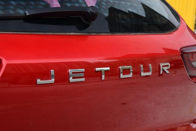 尾部相较于车头并没有运用很夸张的元素,整体设计属于简洁大方那种,除了简单的标识外,并没有过多的线条修饰。尾灯组中央标有"JETOUR"字样LOGO。