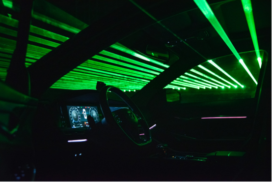 在第一个实验活动中可以看到,车内净化系统开启后,在车外环境里清晰可见的激光束在汽车里面逐步变浅。