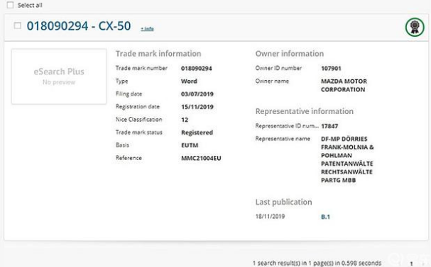 新款车型将使用后驱平台打造,带来更富乐趣的驾驶体验。马自达已在2019年7月将 CX-10、CX-20、CX-40、CX-50、CX-60、CX-70、CX-80、CX-90等车名于欧洲注册,推估新一代 CX-5有可能改名为 CX-50亮相。