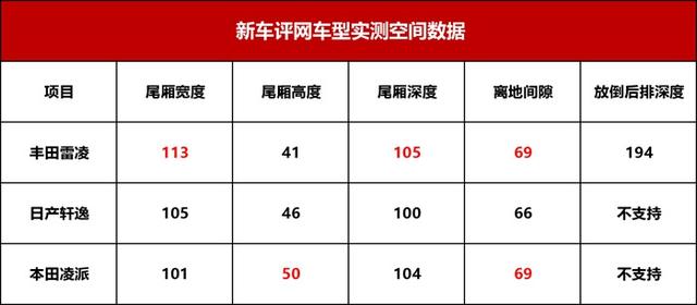 从上述实测表格可以看出,丰田雷凌在实测数据这项对比当中,几乎占不到什么优势;日产轩逸则在头部以及垂直等纵向空间表现上很出色;本田凌派则是拿住了腿部空间、膝部空间等纵向空间的优势,三辆车的空间数据特色都非常明显。