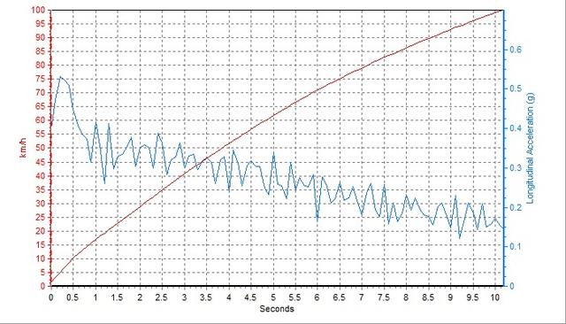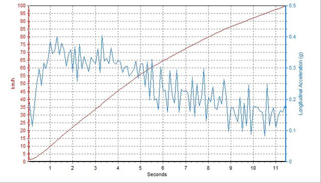 如图中曲线所示,起步初段G值可以较长时间地维持于0.4G范围内,待到中段后才会因为排量的限制而出现动力平缓的迹象。而且相对于日产、丰田两家,本田的CVT调校是最为激进的,在起步初段你甚至能感觉到轻微的顿挫。最终凌派最佳的百公里加速成绩为11.4s。