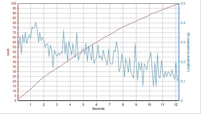 可以看到,整个加速过程中雷凌的G值都比较平缓,仅有起步初段能达到0.4G(推背感知几乎没有),不过好在丰田的新世代车型调校水平很高,CVT变速箱的动力衔接做得是这三台车里面最好的。不过,它最佳12.2s的百公里加速成绩只能位列最后了。