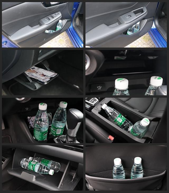 相对于丰田雷凌在储物空间上的设计感,日产轩逸则明显要简单实用很多。最前面的手机置物槽开口很大、空间规整、还带防滑垫,实际使用体验很好。另外在中央扶手箱、副驾手套箱,以及门板的储物盒方面,这辆车也都是秉持着实用为上的原则,空间都是尽量做大,且内部规整。