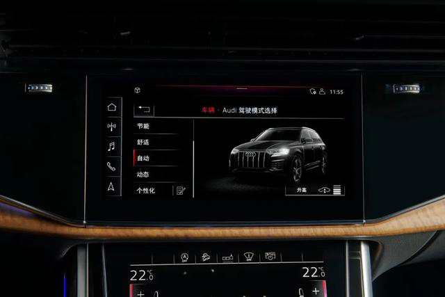 内饰方面,新车采用了家族式三屏设计,科技感极强。车内大面积采用烤漆、木纹以及皮质材料,质感不俗。此外,新款 Q7 还标配手机无线充电板和 Audi Connect 互联功能。在车内空间、前后排头部空间和肘部空间方面均优于直接竞品。座舱内部采用了奥迪新款双屏MMI Touch布局。根据市场需求提供五座和七座布局,五座车型的后备箱空间为865-2050升。电动尾门为标配,感应开启为选配。