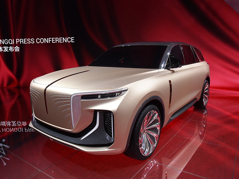 从外观上可以看到,量产版车型在整体轮廓上延续了概念车的设计,给人方方正正,四平八稳的感觉。由于定位纯电动车型,虽然硕大的中网与红旗H9 (配置|询价)一样采用直瀑式设计,但实际为全封闭的状态,正中间的“红旗”红色装饰条,从进气格栅一直延伸到前机盖上。新车采用分体式大灯组,远/近光灯组藏于两侧风道造型内。