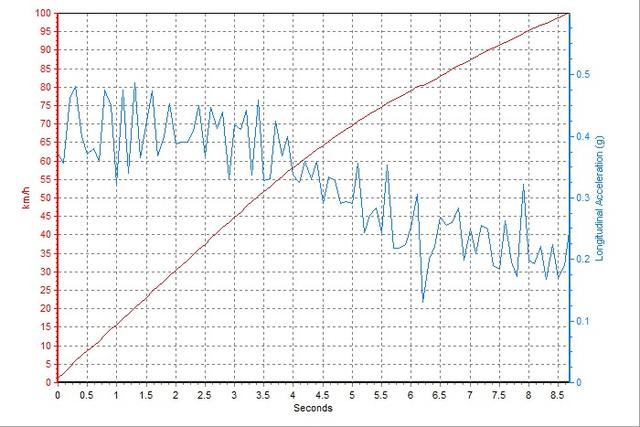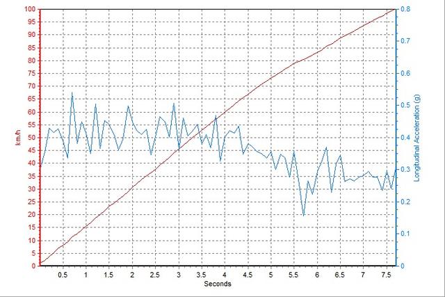 从上述馈电加速图可以看出,整车的动力响应非常快,仅0.1秒左右就产生了G值变化,此后密集且波动明显的G值曲线,也可以看出此时动力轮打滑后ESP介入的动作。另外时速60km/h之后,整车加速能力有了较明显的降低,此时电机的辅助作用减小,主要靠发动机来驱动行驶。