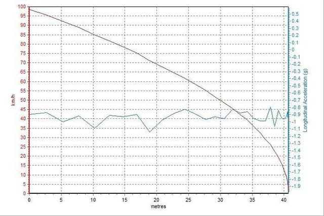 从刹车曲线图可以看出,在整个刹车过程当中减速G值是非常稳定的,这代表着车内乘客此时会处于相对舒适的状态,这点值得肯定。不过在实际驾驶过程当中,这款车刹车踏板的行程设定会稍显过长,每次刹车脚底的动作幅度较大,如果能适当缩短踏板的行程,日常驾驶体验会更好。