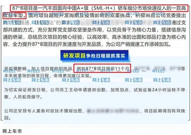 从友媒公布的这张一汽丰田内部文件内容来看,“87*B项目是其面向中国A+级轿车细分市场快速投入的一款高收益车型。”原文件中的这句话中有三个关键词,一个是“A+级”,一个是“快速投入”,另一个是“高收益车型”。