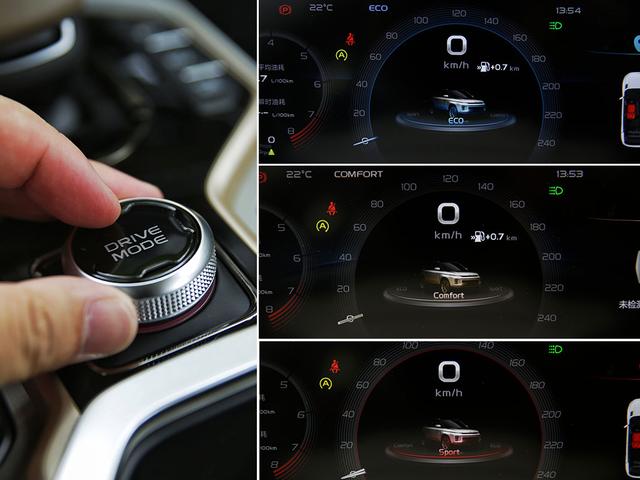 吉利ICON提供ECO(节能)、Comfort(舒适)、Sport(运动)三种驾驶模式,三种模式之间有明显的区别,ECO模式下,电机是主力,发动机一直处于低转速,加速也不会有明显的动力提升。