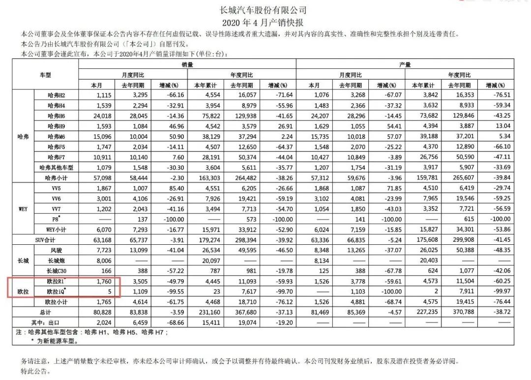 据长城汽车日前公布的4月产销快报来看,包括哈弗、WEY、长城、欧拉品牌在内,共有三款新能源车型——WEY P8、欧拉R1和欧拉iQ,三款车型今年4月的销量共计1765辆。值得一提的是,WEY P8目前处于停售状态。