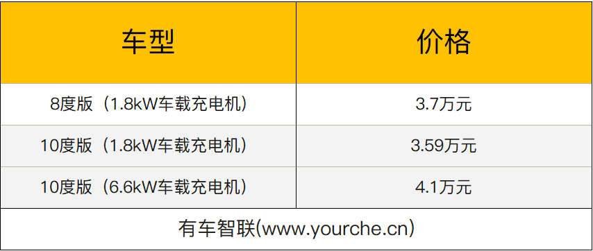 动力方面,新车提供配备8kWh和10kWh的磷酸铁锂电池车型可选,电机的最大功率为13千瓦,续航里程可达100km。此外,新车还将根据版本的差异提供1.8kW和6.6kW的车载充电机。