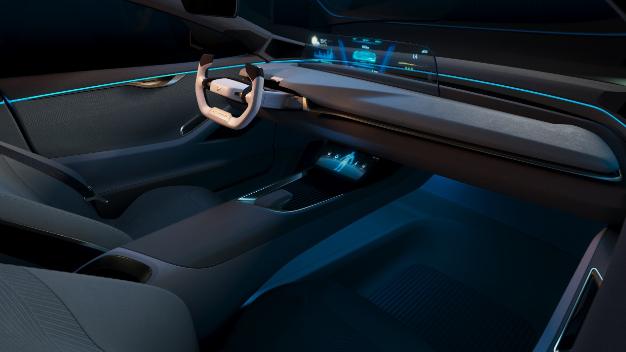 在充分考虑了自动驾驶所带来的座舱体验变革的前提下,威马Maven采用创新式自适应座舱设计,通过屏幕移动和方向盘的收缩设定,满足不同的出行场景需求。