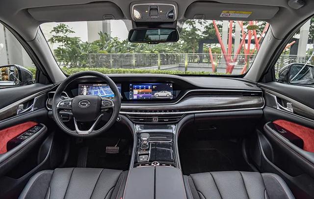 内饰与GA6风格相同,但全新GA8的中控设计更让人有种奔驰S级 (配置|询价)的既视感,双大屏能够营造强烈的科技感,木纹和镀铬的搭配点到为止,材质运用很协调,但座椅的红色缝线和门板的红色翻毛皮,用于GA8上似乎有点格格不入,毕竟这是一台主打舒适、家用或者商务的大中型轿车,无需将过多的运动元素融入其中。