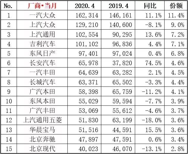 另外,在自主品牌中,吉利汽车在四月份也有4.4%的同比增长,销量仍然是自主品牌第一位。