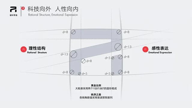 据官方称,R字母的优点在于简单、通用,设计难点在于它是26个字母中极少的既不左右对称也不上下对称的字母。设计团队秉持“少物性,多人性”的手法对字母进行设计形变,以理性结构表达感性。R的大轮廓采用两个1597:987的圆形框成,实现黄金比例;各倒角数值采用斐波那契数列,呈现秩序之美;整体打造出“均匀齐整,体正势圆”的视觉效果。