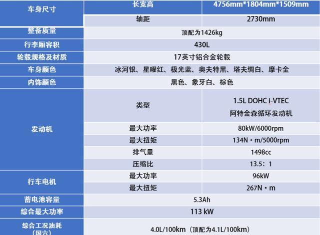 动力参数上,发动机最大功率为80kW/6000rpm,最大扭矩为134N·m/5000rpm,电机最大功率为96kW,最大扭矩为267N·m,锂离子蓄电池容量为5.3Ah,系统综合功率为113 kW,百公里综合油耗为4.0L/100km(较重的顶配车型为4.1L/100km)。