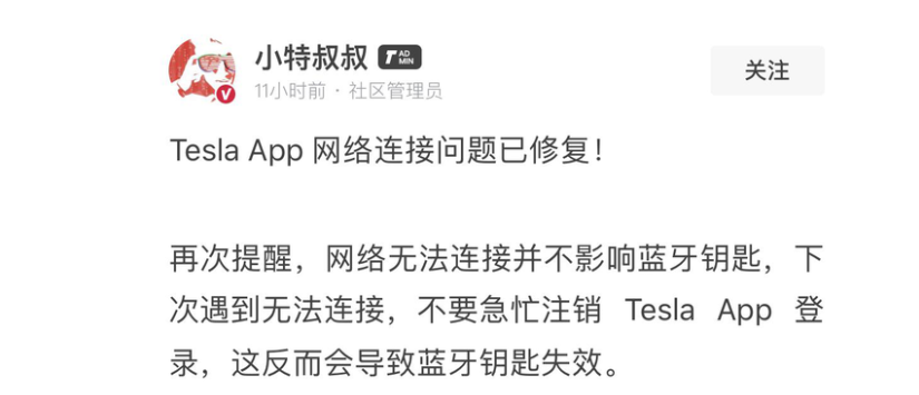 据了解,供应商会提前一个月通知证书即将过期的消息,这段时间内特斯拉有充足的时间完成续费,然而特斯拉却忘了?具体为何没有续上费导致App宕机,我们也在第一时间资询问了特斯拉中国,不过截止发稿前,特斯拉方面没有进行任何回复。不过特斯拉在小特App社区发出了公告,并指导了车主再遇到类似问题的解决方案。