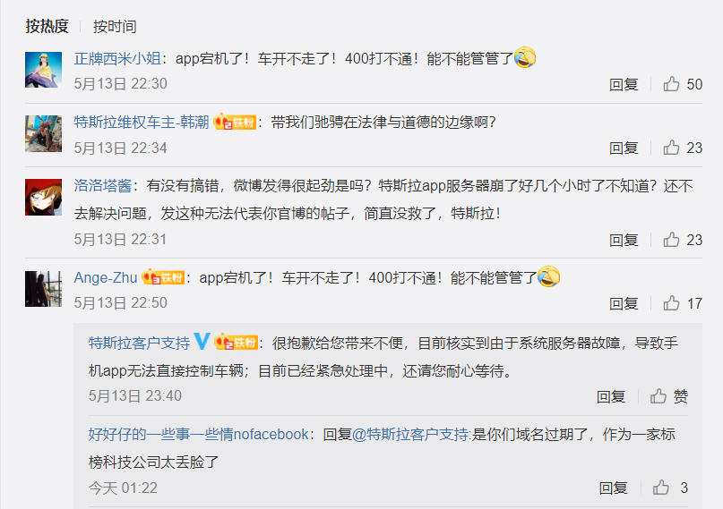 在5月13日晚20点左右,许多车主在社交网站上抱怨特斯拉App宕机。其中几位主表示,由于特斯拉App宕机,他们不得不打车回家。还有一些特斯拉车主在表示,他们被锁在车外近四个小时,甚至还有一些车主被困在充电站。同时也有车主表示因此问题拨打特斯拉400电话,可是电话一直处于无人接听状态,特斯拉线上客户支持回复相关问题称,是由于系统服务器故障导致手机App无法直接控制车辆。