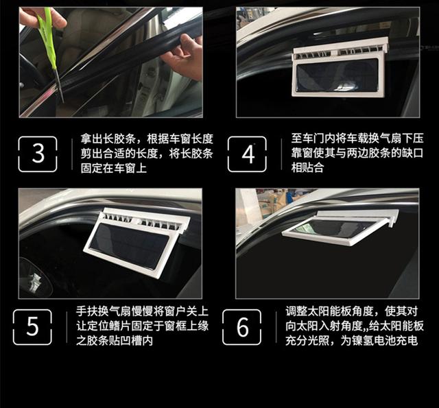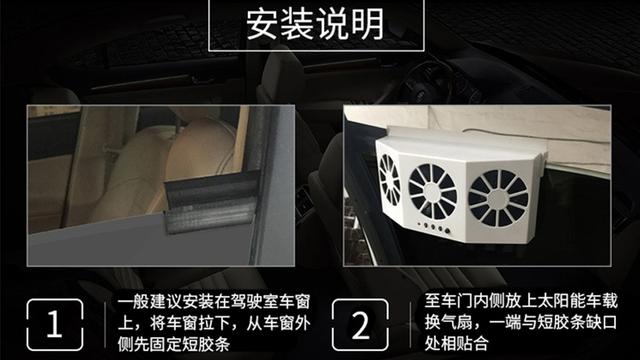 产品介绍上的使用方法比较简单,只需要将排气扇卡在车窗玻璃上,在量出和自己车窗长度相同的密封条,再安装好密封条就好了,而且安装后无需反复拆装,产品介绍中还推荐安装的在驾驶员一侧的玻璃上。