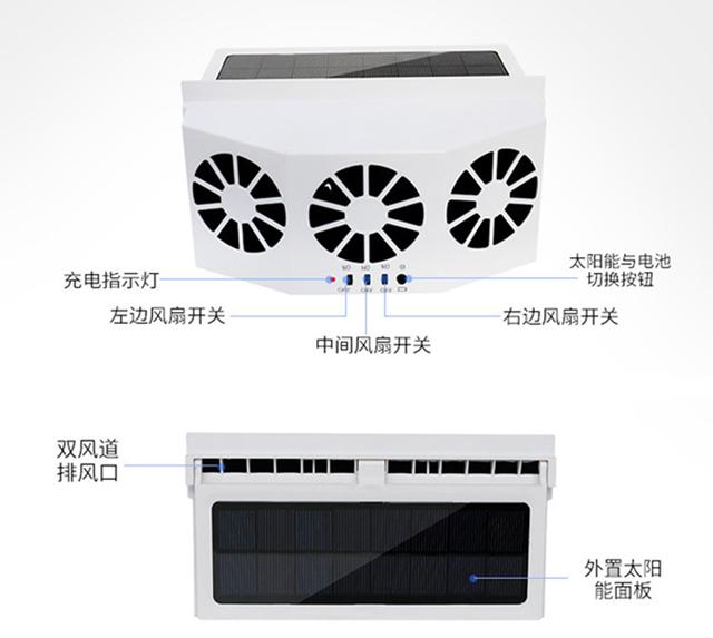 网上卖的太阳能排气扇结构都比较简单,一般由一块太阳能板,一到三个风扇,一块电池,还有就是框架组成,有的还有个温度传感器。一般购买时还有配套有车窗密封条。