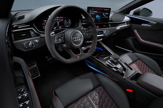 内饰方面,新款奥迪RS5的车内更是将运动和科技融合,比如标配的Alcantara材质的座椅或者是选装的Nappa皮革材质,以及10.1英寸的MMI触控屏和12.3英寸全液晶仪表盘。车载操作系搭载了源于全新的第三代模块化信息娱乐平台,它可以实现告知驾驶者发动机和变速器的温度、最大纵向及横向加速度、胎压和温度等功能。