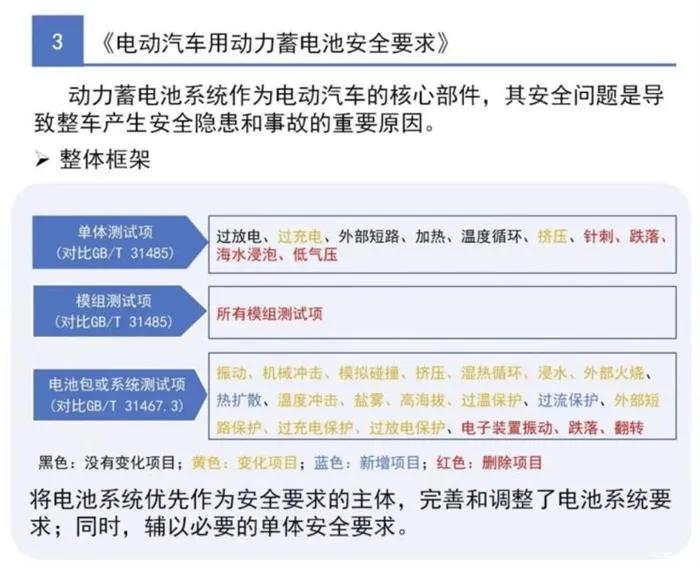 电池包或系统测试项中,则对震动、机械冲击、模拟碰撞外部碰撞等项目进行优化,同时增加了热扩散和过流保护项目。