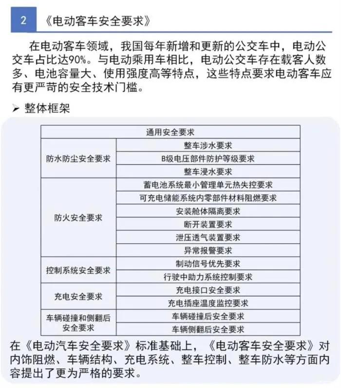 由于电动客车具有载客人数多、电池容量大、驱动功率高等特点,因此《电动客车安全要求》对电池仓部位碰撞、充电系统、整车防水试验条件等提出了更为严苛的安全要求。