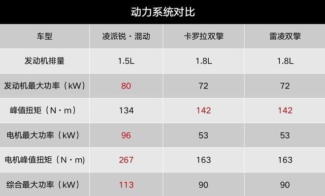 相比于仅有的同级别竞品卡罗拉/雷凌双擎,凌派锐·混动不仅发动机功率强于丰田系的对手,电机功率和综合最大功率都要更加出色。