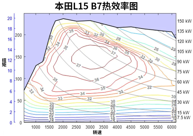 在这里我想多提一嘴,如果想发挥出发动机的最大热效率,其实只有在发动机转速和负载(扭矩)这两个变量维度同时都达到标准时才能实现。而对于非混动车型来说,无论什么形式的变速箱,哪怕是可以持续变扭的CVT,实际上都很难维持在发动机最大热效率那个点上,所以对于非混动车型来说,更宽范的第二大热效率区域的数值反而更值得参考。