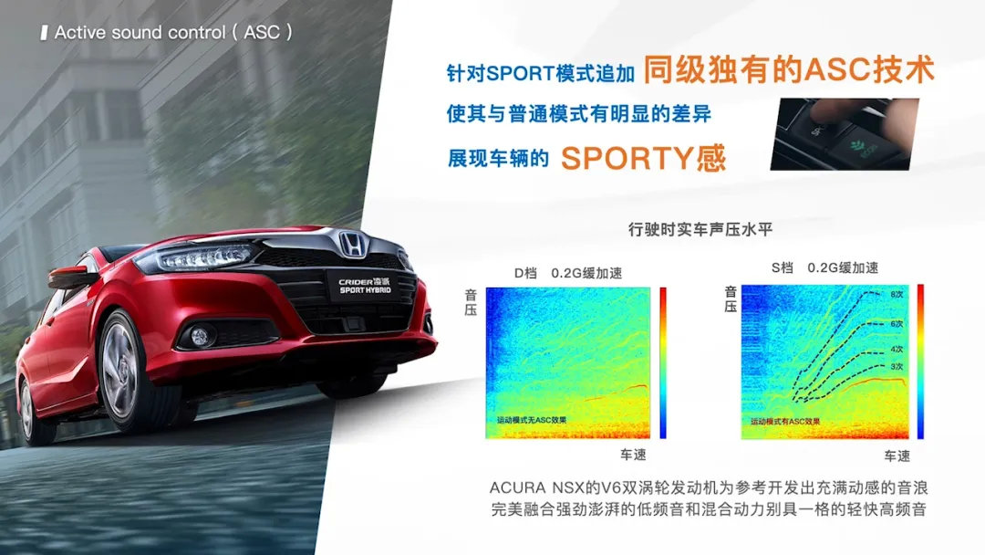 此外,凌派锐混动还配备了Sport运动模式以及带有Kick Down功能的油门踏板,当你把油门踩到底并触发Kick Down按钮的话,由于没有传统意义上的变速箱,电机可以瞬间以最大功率进行加速,营造出十足的运动感。与此同时,本田还为凌派锐·混动增加了音浪模拟系统,而且模拟还是本田自家顶级超跑NSX上那台3.5T V6的声音,真是光想想就已经十分激动了!