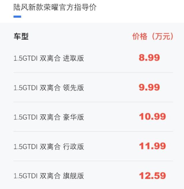 近日,新款陆风荣耀上市,新车是一款紧凑型SUV,新车整体无太大变化,相对老款,新款增加了配置车型,新车共有5款配置车型。