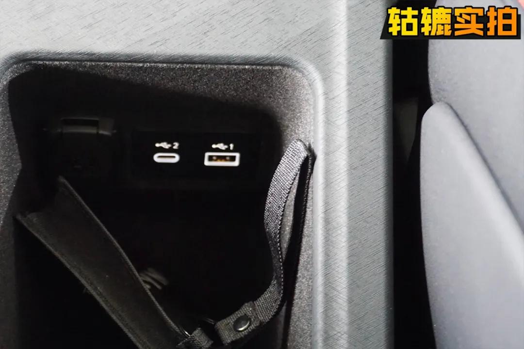 值得一提的是,扶手箱内配备了多种接口,并且还有发光设计,包括后排的充电接口也是如此,方便黑暗中操作。