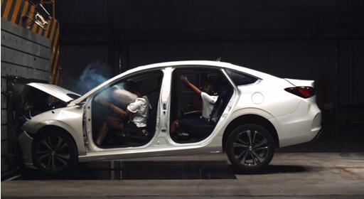 长安逸动PLUS载着4个假人,从130米的轨道冲出,“碰”的一声撞上刚性墙壁,通过慢镜头来看,当前保杠发生变形时,主副驾安全气囊迅速弹出,有效地保护了驾乘人员的上体,两个前纵梁的吸能盒吸收了大部分的冲击能量,使得两个前轮并没有发生移位,保证了驾乘人员的下肢安全。整车的A、B、C柱也没有发生变形,后排乘客在安全带的保护下,也没有受到重大伤害。整体来说,在此次碰面实验中,长安逸动PLUS有效地保证了驾乘人员的安全。