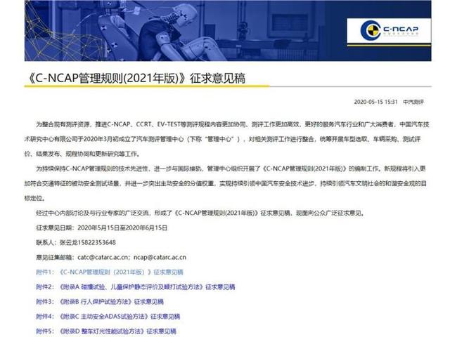 近日,中国汽车技术研究中心有限公司汽车测评管理中心(以下简称:中汽研)对外宣布,为整合现有测评资源,推进碰撞测评规程内容更加协同、更加高效,并更好的服务汽车行业和广大消费者,现向公众广泛,征求意见日期为:2020年5月15日至2020年6月15日。