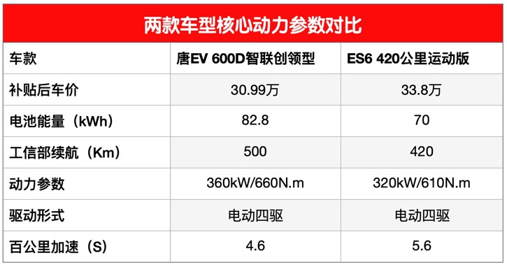 以上是我选取的唐EV和ES6热销的车款在动力和续航方面的对比。