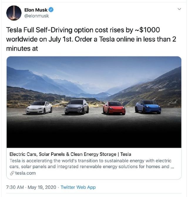 近日,特斯拉(Tesla)首席执行官埃隆·马斯克(Elon Musk)在推特上表示,7月1日起,Tesla选装提供的“完全自动驾驶(FSD)”功能将在全球范围内上涨1000美元(约合7100元人民币)。