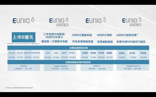 与此同时,EUNIQ系列还推出了三年免费充电服务/3000元充电卡、4000元置换补贴、5000元保险、6000元现金优惠,并赠送新一代智能充电桩、终身免费基础流量、免费道路救援、免费升级N95级空气滤芯一系列上市好礼。