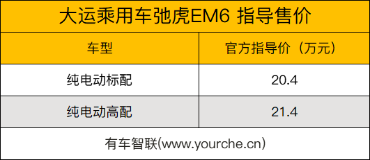 日前,我们从官方渠道获悉,大运乘用车悦虎ES3 (配置|询价)及弛虎EM6两款新车现已正式上市,其中悦虎ES3定位于一款小型纯电SUV,仅提供1款车型,官方指导售价为8.78万元;弛虎EM6定位于一款纯电MPV,共推出2款车型,官方指导售价区间为20.40万-21.40万元。